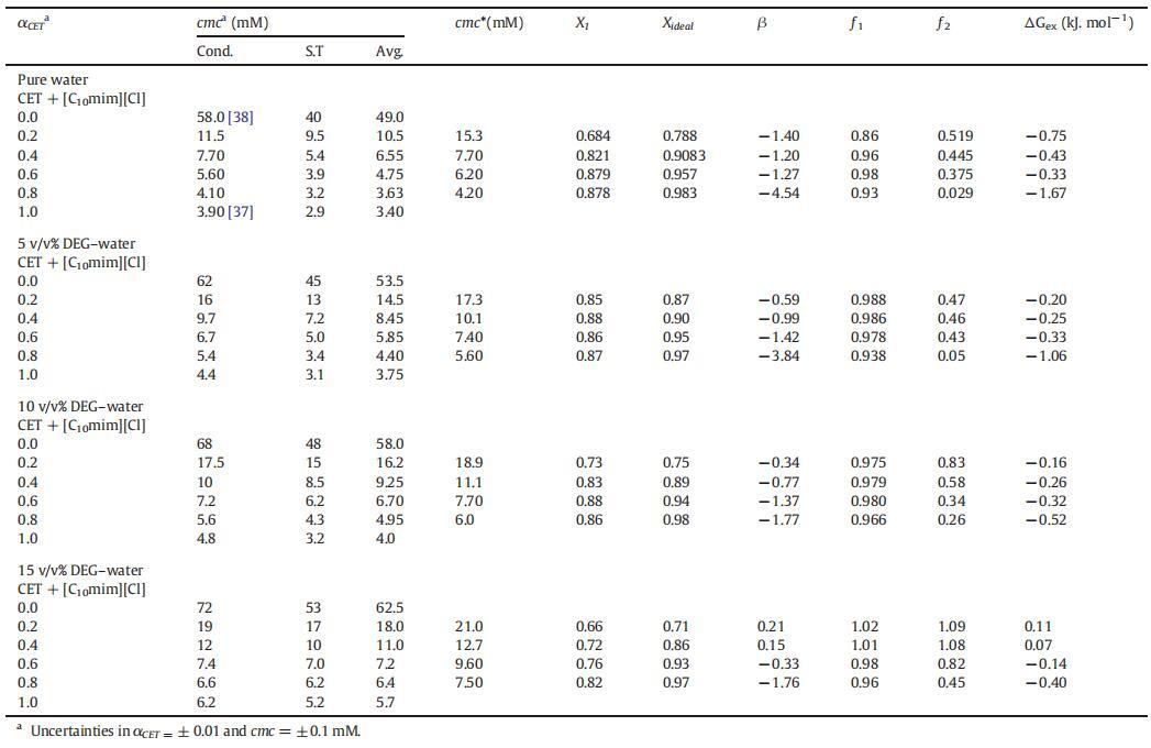 表1列出了根據(jù)式(3)計(jì)算的純水中的β值。在存在不同體積百分比的二甘醇-水二元溶液的情況下,也測定了類似值,如表1所示。β的值可以是正(拮抗作用)、負(fù)(協(xié)同作用)或零(組分之間無相互作用)[51]。此外,β的負(fù)值意味著IL和表面活性劑之間的吸引力大于單個(gè)組分之間的吸引力。從表1可以看出,對(duì)于所有二元混合物,β值均為負(fù)值,然而,隨著DEG的量從5增加到15 v/v%,負(fù)值減小,令人驚訝的是,對(duì)于αCET=0.2和0.4,β值均為正值。β的負(fù)值通常是混合膠束中有利相互作用的原因,然而正值意味著不利相互作用[53–54]。因此,從表1中可以看出,作為膠束形成主要力量的協(xié)同作用隨著DEG量的增加而減少。這種下降的原因可能是DEG的結(jié)構(gòu)破壞能力導(dǎo)致單體之間的疏水相互作用減少,從而降低了它們的協(xié)同作用。