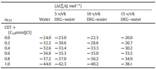 從表2中可以清楚地看出,g值并不遵循特定的趨勢,但是隨著DEG在混合系統(tǒng)中的體積百分比的增加,其g值以某種方式增加,這種增加可能是因?yàn)槟z束的表面電荷密度降低,這是由于膠束聚集數(shù)減少所致。水和DEG-水二元混合物中CET、[C10min][Cl]和CET+[C10min][Cl]混合膠束的標(biāo)準(zhǔn)吉布斯自由能(ΔGm0)值如表3所示。如表3所示,隨著二甘醇與水的體積百分比的增加,膠束化過程變得不那么自發(fā)。