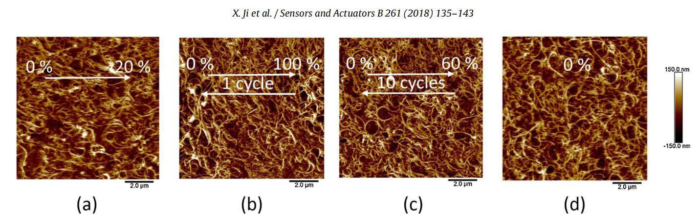 從圖5a(施加在PDMS基板上的20%單軸應(yīng)變)可以看出,WCNT在拉伸方向上輕微變形,但保持互連。對(duì)于應(yīng)變?yōu)?%的器件,在100%單軸應(yīng)變后或在60%單軸應(yīng)變的10個(gè)周期后拍攝,AFM圖像顯示互連的MWCNT網(wǎng)絡(luò),表明拉伸至100%(圖5b)或在60%單軸應(yīng)變的10個(gè)周期后(圖5c)不會(huì)破壞網(wǎng)絡(luò)。對(duì)于所有拉伸條件,與未施加任何應(yīng)變的樣品相比,一旦樣品松弛至0%應(yīng)變,則在該長(zhǎng)度范圍內(nèi)未檢測(cè)到顯著的形態(tài)變化(圖5d)。