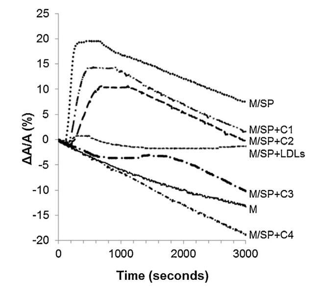 圖5。注入(…)后,由單層(M)覆蓋并在不含(-)額外分子的緩沖液上形成的界面的相對表面積隨時間的變化SP(26.6±1.5 mg蛋白質(zhì))、SP(26.6±1.5 mg蛋白質(zhì))和不同濃度(··-)C1、(·-)C2的脂質(zhì)體的混合物,(·-)C3和(·-)C4(分別為1.17±0.02 mg、2.18±0.02 mg、4.37±0.02 mg和6.55±0.02 mg脂質(zhì))和(---)LDL(4.6 mg PC)和SP(26.6±1.5 mg蛋白質(zhì))的混合物??諝?緩沖界面處的溫度為34℃。表面壓力保持在25 mN/m。
