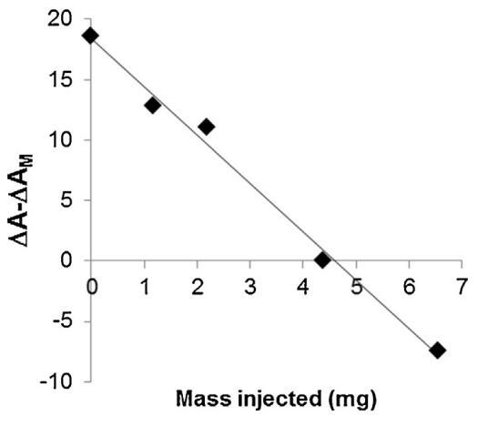 脂質(zhì)體(不同濃度)對BSP蛋白的作用也如圖5所示。脂質(zhì)體在進入亞階段前與精漿接觸。隨著脂質(zhì)體中濃度的增加(曲線M/SP+C1至C4),BSP蛋白吸附引起的表面積增加逐漸延遲并減少。當(dāng)含量達到4.37 mg(C3)時,界面上仍有少量BSP蛋白摻入,1600 s時出現(xiàn)肩部。在最高濃度(C4)下,未觀察到BSP蛋白摻入,分子面積的變化甚至比對照曲線更負,表明膜組分在亞相中輕微溶解。因此,脂質(zhì)體作用于BSP蛋白的方式與LDL相同。最有趣的比例似乎介于C3和C4之間。根據(jù)確定面積變化與脂質(zhì)體注射磷脂質(zhì)量之間相互作用的曲線計算得出(圖6)。注射26.6 mg BSP的最佳質(zhì)量為4.6 mg,即PC:BSP比為0.16(w/w)。