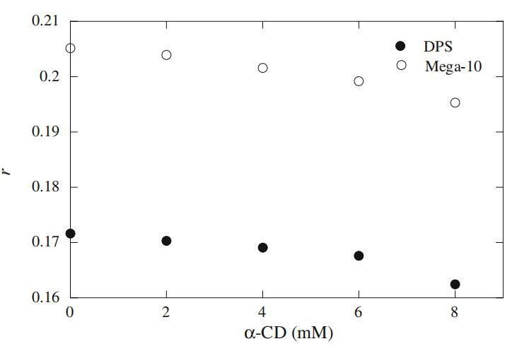 圖12恒定表面活性劑濃度(Mega-10,20 mM和DPS,15 mM)下熒光各向異性r與α-CD濃度的關(guān)系圖