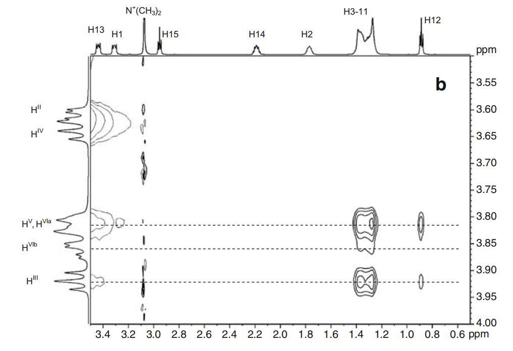 圖7a顯示了α-CD、DPS和Mega-10的示意圖,以簡(jiǎn)化表面活性劑原子與CD原子的相互作用。2DROESY數(shù)據(jù)證明表面活性劑的烷基鏈包含在α-環(huán)糊精的疏水腔中。光譜如圖7b和c所示。可以看到表面活性劑共振與位于環(huán)糊精空腔內(nèi)的HIII、HV和HVI共振的交叉峰。未觀察到分子(HI、HII和HIV)外部與環(huán)糊精原子的相互作用。對(duì)于這兩種表面活性劑,與HIII和HV的相互作用似乎覆蓋了從末端甲基到H3的整個(gè)烷基鏈。這意味著幾個(gè)不同的復(fù)雜幾何形狀和穿透深度之間的快速交換。在鎘原子和親水性頭基之間沒(méi)有觀察到相互作用。
