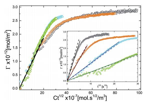 圖5吸附量(G)作為產(chǎn)品Ct1/2的函數(shù)。插圖顯示了不同體積濃度的微凝膠顆粒的G與t1/2的單獨(dú)曲線:(>)0.10 G l-1,(D)0.20 G l-1,(,)0.50 G l-1,(B)1.00 G l-1。實(shí)線是直線擬合,虛線是使用D=DDL計(jì)算的坡度繪制的。