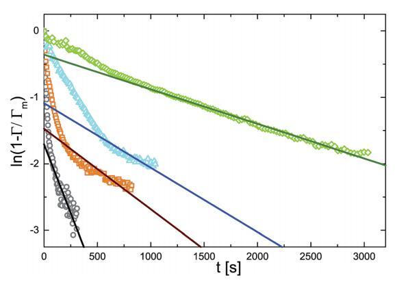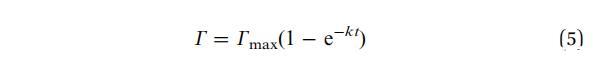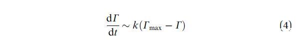 當(dāng)系統(tǒng)接近飽和時(shí),G(t)的下降速度必須隨著表面變得擁擠而減慢。吸附質(zhì)濃度剛好低于表面,然后與吸附物種失去平衡,動力學(xué)受到吸附屏障的限制。一級動力學(xué)過程會導(dǎo)致:
