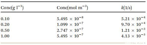 表2根據(jù)圖6中的實(shí)驗(yàn)曲線計(jì)算的各種濃度的速率常數(shù)k(1/s)值