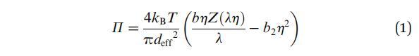 吸附在流體-流體界面上的顆粒相互作用并產(chǎn)生表面壓力(P),這是3D系統(tǒng)中壓力的2D模擬。通過進(jìn)一步擴(kuò)展這種類比,還可以通過狀態(tài)方程將表面壓力與其他狀態(tài)參數(shù)(如數(shù)密度和溫度)聯(lián)系起來。對于吸附在流體-流體界面上的膠體粒子,最簡單的近似可能是2D硬盤。單組分系統(tǒng)的狀態(tài)方程(EOS)是根據(jù)壓縮因子Z的密度依賴性給出的。文獻(xiàn)中充滿了多種方法來提供2D硬盤流體狀態(tài)方程的表達(dá)式。Mulero等人27,28簡要回顧和比較了所有這些狀態(tài)方程。
