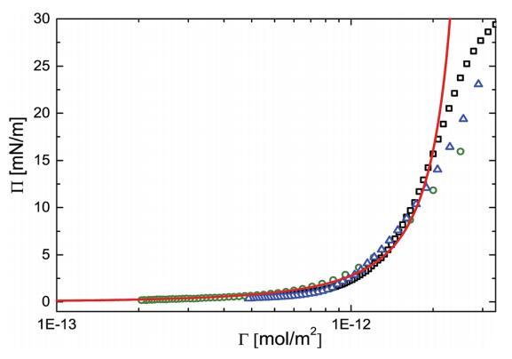 圖2表面壓力(P)與空氣-水界面上PNIPAM顆粒吸附量(G)的關(guān)系。開放符號表示與三組不同實(shí)驗(yàn)相對應(yīng)的實(shí)驗(yàn)數(shù)據(jù)點(diǎn),即:(,)具有高初始顆粒負(fù)荷的NIMA槽,(B)具有低初始顆粒負(fù)荷的NIMA槽和(D)具有高初始顆粒負(fù)荷的Kibron m槽。紅色實(shí)線表示使用Groot和Stoyanov模型進(jìn)行的預(yù)測。
