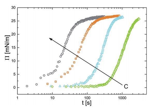 在建立了一個(gè)狀態(tài)方程來關(guān)聯(lián)表面壓力和吸附量之后,我們現(xiàn)在開始研究粒子的吸附動力學(xué)。為此,我們監(jiān)測了PNIPAM顆粒懸浮液中新制備氣泡的界面張力隨時(shí)間的變化。我們將界面張力值轉(zhuǎn)換為表面壓力。結(jié)果如圖4所示。表面壓力值最初迅速增加,然后放松到最終平衡值。動力學(xué)可以清楚地分為兩個(gè)獨(dú)立的時(shí)間尺度:一個(gè)是表面壓力值增加表示的初始快速動力學(xué),另一個(gè)是系統(tǒng)向最終平衡狀態(tài)松弛時(shí)的緩慢部分。短時(shí)間快速動力學(xué)和長時(shí)間慢得多動力學(xué)之間的區(qū)別是許多表面活性材料吸附行為的特征。32,33