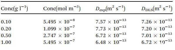 表1根據(jù)實(shí)驗(yàn)G與t1/2曲線計(jì)算的不同濃度的擴(kuò)散系數(shù)D(m2 s-1)值與使用DLS測量的值相比
