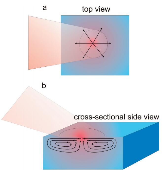圖4。水樣近表面區(qū)域穩(wěn)態(tài)加熱引起的流動示意圖。溫度示意圖上用顏色表示,其中紅色表示熱,藍(lán)色表示冷。橙色陰影區(qū)域顯示入射到表面的激光束,箭頭表示溫度梯度誘導(dǎo)流動的方向。(a)俯視圖,顯示近表面區(qū)域的徑向位移,(b)橫截面?zhèn)纫晥D,顯示產(chǎn)生的Marangoni流動單元。請注意,在焦點的中心,水流向上,因此表面可以有效地持續(xù)更新。