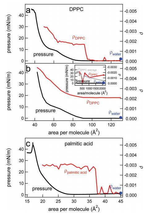 圖8。(a)在制備單分子層后,通過快速添加DPPC溶液持續(xù)壓縮單分子層,直到達(dá)到130?2的每分子面積,水上DPPC的表面壓力(黑色,左軸)和橢圓系數(shù)(紅色,右軸)。(b)水上DPPC的表面壓力(黑色,左軸)和橢圓系數(shù)(紅色,右軸)是每個分子面積的函數(shù)。通過逐滴添加更多DPPC,每次滴加間隔幾分鐘,改變了該區(qū)域。以這種方式達(dá)到的每個分子的最小面積為2000?2。插圖顯示了橢圓度系數(shù)(對于一個特定實驗(紅色)和三個實驗的平均值(灰色))以及非常低密度下的壓力。(c)在制備單分子層后,通過快速添加棕櫚酸溶液,直到達(dá)到每分子45?2的面積,連續(xù)壓縮單分子層期間,水上棕櫚酸的表面壓力(黑色,左軸)和橢圓系數(shù)(紅色,右軸)。在噴灑表面活性劑之前測量的純水橢圓度在每個面板中以藍(lán)色圓點表示。