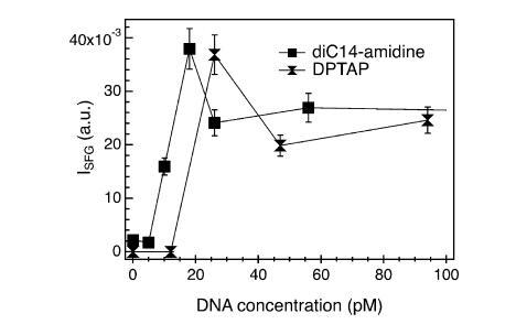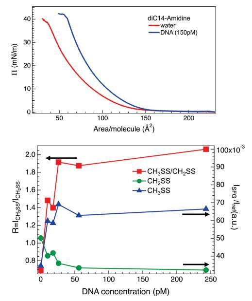 圖7。(上圖)在不存在(紅線)和存在(藍線,150μm)DNA的情況下,磷酸緩沖亞相上方的diC14氨基單層的π-面積等溫線。對于給定的脂質(zhì)密度,將DNA添加到亞相會導致表面壓力增加,或者相當于脂質(zhì)分子的凝聚。(下圖)不同濃度的DNA溶液上的CH2SS和CH3SS共振(三角形和圓形,右軸)的VSF強度及其比率R(正方形,左軸)。實線是眼睛的向?qū)А?