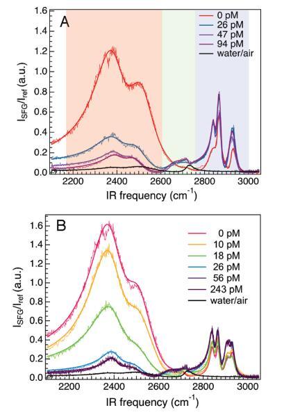 界面水的光譜響應。圖2顯示了在2100-3100 cm-1范圍內(nèi),隨著亞相DNA濃度的增加,DPTAP、diC14氨基和DPPC單分子膜的VSF光譜。對這些數(shù)據(jù)的粗略檢查顯示出幾個特征。聚焦于圖2面板A,從低頻向高頻移動,很明顯,有一個巨大的雙峰結構,隨著DNA的加入,其振幅突然降低(透明的紅色矩形);一個小的、更高頻率的峰值(以≈2675 cm-1),隨著DNA(透明綠色矩形)的加入而增加;在2800-2950 cm-1的頻率范圍內(nèi)有幾個較窄的峰值(這些峰值是CH拉伸振動的結果,顯示在一個透明的藍色矩形中,下面將進一步討論)。