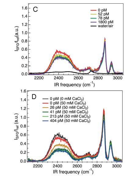 圖2。VSF光譜是OD拉伸區(qū)2100-2700 cm-1和CH拉伸區(qū)2850-2975 cm-1的DNA濃度的函數(shù)。陽離子脂質(zhì)單分子膜的脂質(zhì)密度為52?2/分子,兩性離子脂質(zhì)單分子膜的脂質(zhì)密度為47?2/分子。A組為DPTAP單層下的VSF光譜,B組為diC14氨基單層下的VSF光譜,C組為DPPC單層下的VSF光譜,D組為含有額外50 mM CaCl2的DPPC單層下的VSF光譜。所有實驗中的亞相都是磷酸鹽緩沖的。每個面板中的單個光譜是具有不同濃度λ-DNA噬菌體的相同系統(tǒng)。每個面板中都顯示了該頻率窗口的磷酸鹽緩沖D2O光譜,以供比較。實體曲線使用公式1擬合數(shù)據(jù)。