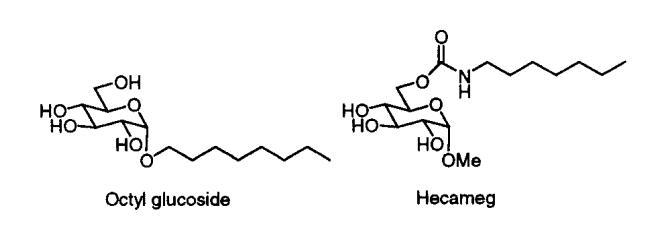 我們的第一個(gè)驚喜是發(fā)現(xiàn)A系列海藻糖雙子座不溶于水。例如,A-12、A-14和A-16(指鏈長(zhǎng)的數(shù)字)在1毫升溫水中旋轉(zhuǎn)2毫克時(shí)會(huì)留下沉淀物。即使在70°C的溫度下,A-10也會(huì)在這種處理過(guò)程中形成渾濁的懸浮液。A-8在室溫下的可溶濃度僅為1-2 mM(根據(jù)動(dòng)態(tài)光散射,在該濃度下,會(huì)形成膠束大小的聚集體)。天真地說(shuō),人們可能會(huì)認(rèn)為a-8的溶解度大得多,因?yàn)樵摲肿佑闪鶄€(gè)羥基和兩個(gè)酰胺組成。盡管相關(guān)的6-氨基-6-脫氧己糖衍生物需要加熱才能溶解,25許多烷基化單糖(例如,辛基葡萄糖苷和甲基6-O-(N-庚基羰基)-R-D-吡喃葡萄糖苷或下面的“Hecameg”)是水溶性的。然而,A-8并沒(méi)有類(lèi)似的天賦。這里的教訓(xùn)是,用一句老生常談的話來(lái)說(shuō),我們的雙子座比其各個(gè)部分的總和要多(或少)。不管老生常談與否,雙子座的獨(dú)特屬性都取決于它。