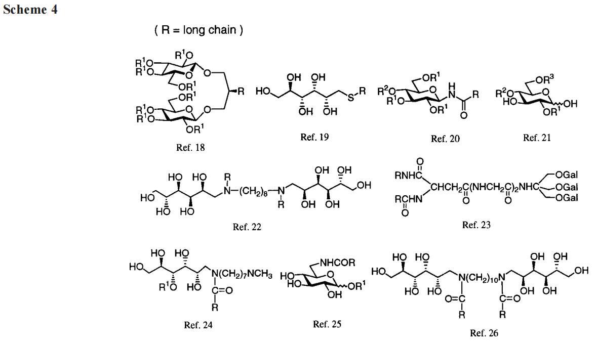 迄今為止的總結(jié)是:A系列海藻糖雙子,對(duì)于10或更長(zhǎng)的鏈不溶于水,形成單分子膜,其界面區(qū)域主要由糖間隔基控制。分子間的鏈/鏈相互作用穩(wěn)定了薄膜。A-8在水中形成小膠束,而水合后,更高的同系物聚集成泡狀和管狀結(jié)構(gòu),在光學(xué)顯微鏡下可見(jiàn)。水化性質(zhì)與凝膠到液晶的轉(zhuǎn)變相一致,事實(shí)上,轉(zhuǎn)變溫度可以通過(guò)量熱法確定。因此,海藻糖雙子的行為與磷脂和合成雙鏈表面活性劑的行為相似。17,37就好像海藻糖不是雙子座的間隔物,而是一個(gè)特別大但傳統(tǒng)的頭群。