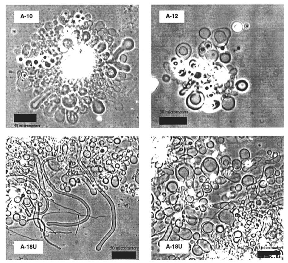 圖2。A-10(左上)、A-12(右上)和A-18U(下)在23°C下水合3-4小時(shí)后形成的囊泡和管狀結(jié)構(gòu)的相襯顯微照片。在45°C下培養(yǎng)的A-14和A-16樣品中觀察到類(lèi)似結(jié)構(gòu)。