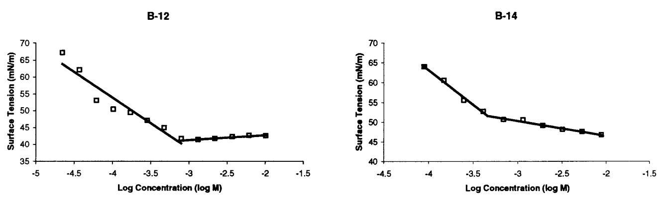 圖4。室溫下測(cè)定B-12和B-14臨界膠束濃度的張力測(cè)定圖。B-14混合后立即進(jìn)行測(cè)量,而B(niǎo)-12樣品老化20分鐘。