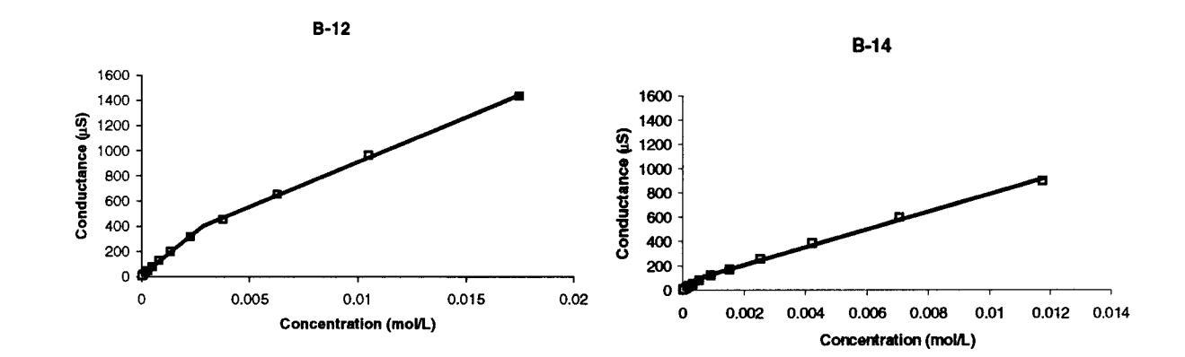 圖5。圖中給出了B-12和B-14臨界膠束濃度,該濃度由電導(dǎo)-濃度曲線中的斷裂點(diǎn)確定。每個(gè)點(diǎn)代表23°C下的單個(gè)電極讀數(shù)。