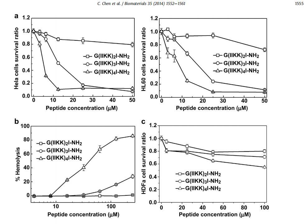 按照濃度依賴性模式,重復(fù)次數(shù)較多或長度較長的肽在殺死癌細(xì)胞(HeLa和HL60細(xì)胞)方面更有效,但對正常細(xì)胞(紅細(xì)胞和HDFa細(xì)胞)的體外毒性也開始增加,如圖1aec所示??偟膩碚f,就體外抗癌活性和細(xì)胞選擇性而言,G(IIKK)3I-NH2是最佳序列,其對HeLa和HL60細(xì)胞的IC50值為15和25 mM,EC50遠(yuǎn)大于250 mM(IC50:濃度導(dǎo)致50%的癌細(xì)胞生長抑制;EC50:濃度誘導(dǎo)50%的紅細(xì)胞溶解)。重要的是,HDFa細(xì)胞對這些肽有良好的耐受性,例如,在濃度低于50 mM時(shí),G(IIKK)3I-NH2對HDFa細(xì)胞的影響微不足道(圖1c)。我們合理設(shè)計(jì)的短肽的這種性能明顯優(yōu)于天然AMP,如馬蓋寧和蜂毒素,并且在有效性、選擇性甚至耐藥性方面也優(yōu)于抗癌藥物順鉑[12e15]。例如,在類似的實(shí)驗(yàn)條件下,magainin-2對HeLa細(xì)胞的IC50低于60 mM,而蜂毒肽在5 mM下的EC50則低得多,顯示出對宿主細(xì)胞的高毒性[12e14]。