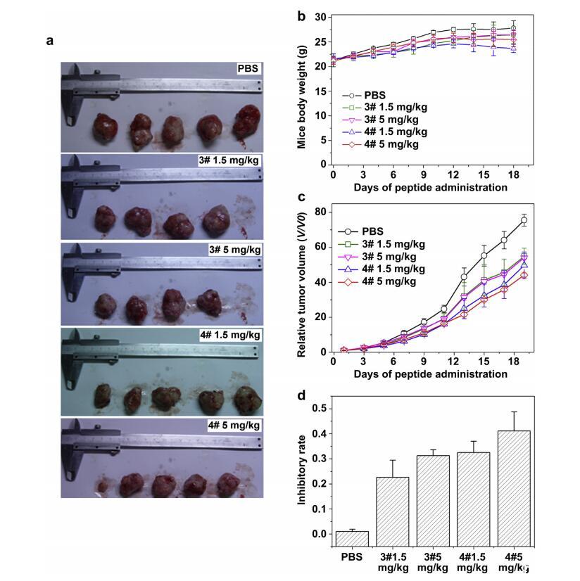 將人宮頸癌HeLa細(xì)胞接種于裸鼠皮下。腫瘤植入5天后,分別以1.5 mg/kg和5 mg/kg的劑量腹腔注射肽G(IIKK)3INH2和G(IIKK)4I-NH2。在給藥期間,未觀察到任何毒性跡象,如體重減輕和外觀不良(圖6b),盡管G(IIKK)4I-NH2顯示出更高的體外溶血性。與PBS中的陰性對照相比,這兩種肽對腫瘤生長表現(xiàn)出明顯的抑制作用,其中G(IIKK)4I-NH2表現(xiàn)出比G(IIKK)3I-NH2更好的療效(圖6c),這與它們的體外抗腫瘤趨勢一致。18天后,解剖腫瘤并稱重(圖6a和d)。在1.5 mg/kg和5 mg/kg劑量下,G(IIKK)3I-NH2治療組的腫瘤生長抑制率分別為0.23和0.31。G(IIKK)4I-NH2能產(chǎn)生更有效的抑制作用,在1.5 mg/kg和5 mg/kg劑量下,抑制率分別為0.32和0.41。這些數(shù)據(jù)表明,在小鼠異種移植模型中,螺旋肽可以有效地抑制腫瘤生長,而腫瘤細(xì)胞不能被完全清除。許多抗腫瘤藥物的不完全抑制作用已被廣泛觀察到,這可歸因于多種機(jī)制,例如藥物從腫瘤部位相對較快地清除,以及它們難以通過壞死區(qū)域擴(kuò)散[42],但目前這組肽背后的確切原因有待進(jìn)一步的機(jī)理研究。
