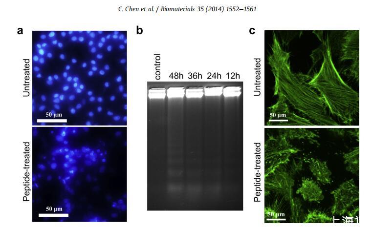 圖4。細(xì)胞凋亡的生化和形態(tài)學(xué)特征。(a)HeLa細(xì)胞與10 mM G(IIKK)3I-NH2孵育24小時(shí)前后的DAPI核染色。(b)HeLa細(xì)胞與10 mM G(IIKK)3I-NH2孵育后提取的基因組DNA的凝膠電泳分析。(c)在與10 mM G(IIKK)3I-NH2孵育24小時(shí)之前和之后,用FITC phalloidin對HeLa細(xì)胞進(jìn)行F-肌動(dòng)蛋白染色。