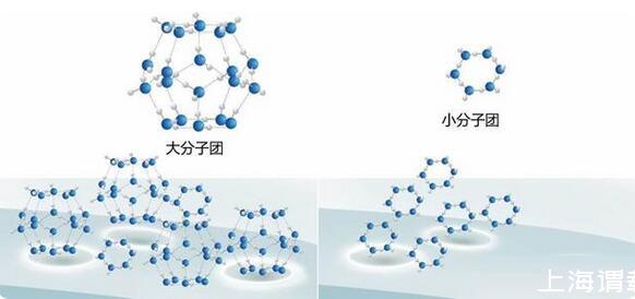 科學(xué)家近些年通過研究發(fā)現(xiàn),氣態(tài)的水可以假設(shè)為單個(gè)水分子或者是二聚體水分子;處于液相與氣相過渡狀態(tài)的水分子可能會(huì)有簡單的三元、四元、五元甚至六元環(huán)形分子存在;液相水分子團(tuán)的結(jié)構(gòu)要大于液相與氣相過渡狀態(tài)的水分子,會(huì)有六元、七元、八元甚至是更大的分子團(tuán)存在。當(dāng)分子簇大于7以后已經(jīng)不大容易形成單個(gè)的環(huán)狀分子簇了,即便可以勉強(qiáng)形成大環(huán)分子狀態(tài)上也十分不穩(wěn)定,很快便會(huì)通過變形轉(zhuǎn)化成折疊形態(tài)或多環(huán)結(jié)構(gòu)。與高分子不同的是由于水分子之間并沒有形成共價(jià)鍵而是以氫鍵相連,因而這種分子鏈在液態(tài)時(shí)十分脆弱,應(yīng)該處于動(dòng)態(tài)下的不斷斷裂和組合過程中。