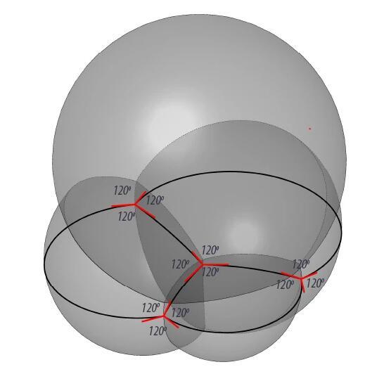現(xiàn)在我們知道了表面張力決定泡泡的連接方式,泡沫總會找到一種具有最小表面張力的結(jié)構(gòu),也就是使總表面積最小的結(jié)構(gòu)。但是,關(guān)于泡沫的結(jié)構(gòu)還需要考慮另一個(gè)問題,即力學(xué)上的穩(wěn)定。在連接點(diǎn)處,沿著不同方向的作用力必須達(dá)到平衡。無論是泡泡筏的平鋪還是泡泡堆的四面相連,都是能滿足這一要求的連接方式。