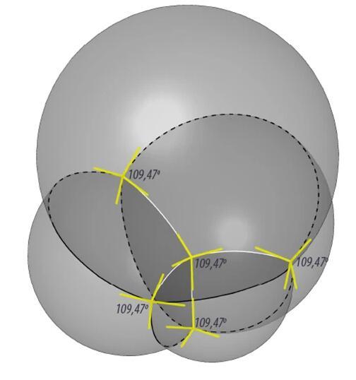 如果我們從平面的泡泡筏推演到立體的“泡泡堆”,結(jié)果也是類似的。假如你用吸管對著一碗肥皂水吹氣,吹起一堆泡沫,你會看到,當(dāng)泡泡堆積在一起之后,它們四面邊界相交于一個(gè)點(diǎn),夾角約為109°——沒錯(cuò),這個(gè)角度就是正四面體中心到各頂點(diǎn)連線的夾角。