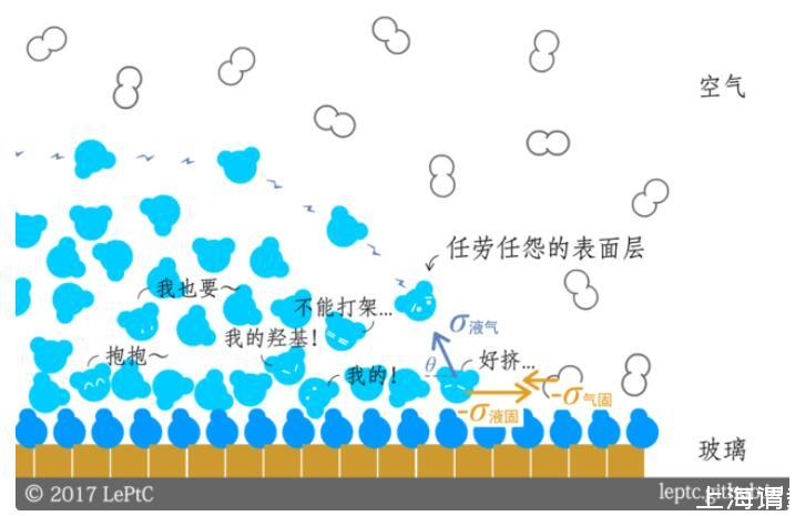 在氣體和液體之外,現(xiàn)在我們再加入新的角色——固體表面。玻璃的表面對水分子非常有吸引力(雖然玻璃的主要成分是二氧化硅,但它的表面通常會因為價態(tài)不飽和而結合很多羥基)。如果水滴碰到的界面是玻璃,就會出現(xiàn)跟空氣相反的情況:接觸面的水分子比平衡時更擠,表面張力是擴張的,表面能是負的,整坨水滴會希望自己跟玻璃的接觸面積越大越好(同時跟空氣接觸面積越小越好),形成特定的接觸角θ。這個角越小,意味著固體表面的親水性越強。