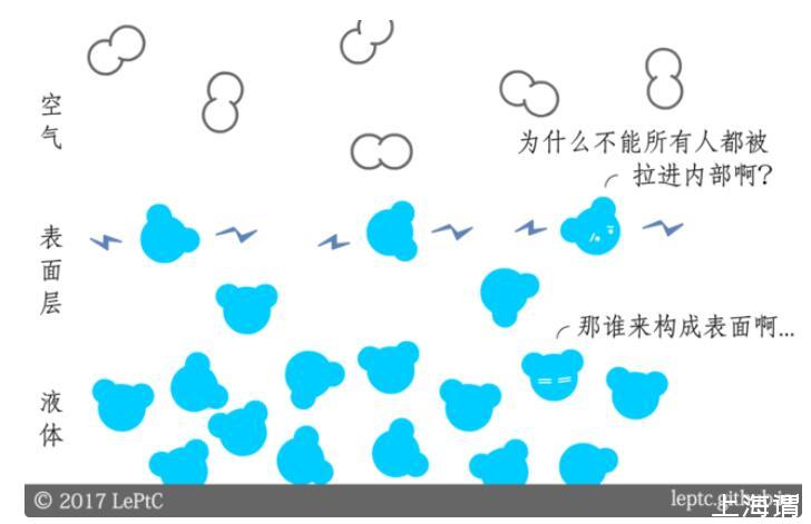 要解釋表面張力,我們首先要走進微觀世界,看看那些液體分子之間是如何互動的: