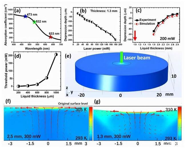 為了探索該光致液體宏觀形變的機理,王志明團隊通過COMSOL(Comsol Multiphysics,多物理場)仿真,首次系統(tǒng)性地研究了影響光致液體下凹形變的多個物理參數(shù),并優(yōu)化了液體最大形變的條件。