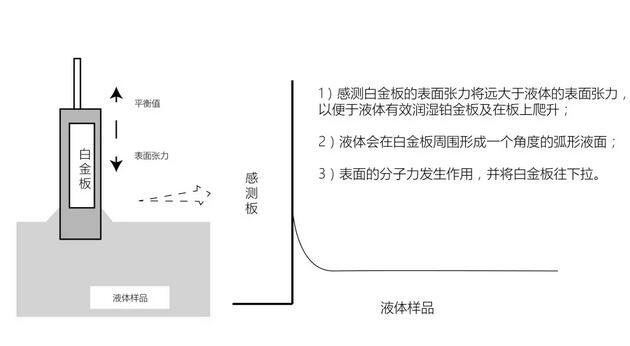 當感測到鉑金板浸入到被測液體后,鉑金板周圍就會受到表面張力的作用,液體的表面張力會將鉑金盡量的往下拉。當液體表面張力及其他相關的力與平衡力達到均衡時,感測鉑金板就會停止向液體內部浸入。這時候,儀器的平衡感應器就會測量浸入深度,并將它轉化為液體的表面張力值。