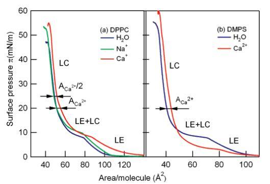 圖2:DPPC(A)和DMPS(b)在不同亞相上的壓力面積(π-A)等溫線:凈水(藍(lán)色)、1 M NaCl溶液(綠色)、1 M CaCl2溶液(紅色)。沿等溫線顯示了液相膨脹相(LE)、液相凝聚相(LC)和兩相共存區(qū)(LE+LC)。ACa2+代表鈣離子的面積。