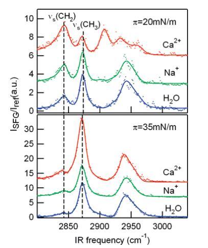 振動(dòng)和頻發(fā)生光譜學(xué)(VSFG)。VSFG是一種非線性振動(dòng)光譜技術(shù),可提供界面分子構(gòu)象順序和方向的表面特定信息,進(jìn)一步研究了在Ca2+存在下這種改變相行為的分子起源。21,22為了量化離子對(duì)脂質(zhì)尾部構(gòu)象的影響,在C-H拉伸區(qū)域收集VSFG光譜。沿等溫線測量了幾個(gè)表面壓力的光譜;圖5顯示了DPPC單層在20 mN/m和35 mN/m下三種不同亞相的光譜??梢杂^察到五種振動(dòng)模式:以2876、2970和2938 cm-1為中心的峰值分別歸屬于CH3對(duì)稱拉伸、CH3反對(duì)稱拉伸和CH3費(fèi)米共振。22 CH2對(duì)稱和反對(duì)稱拉伸頻率約為2846和2920 cm-1。氘化DPPC脂質(zhì)單層(d62和d75 DPPC)上的VSFG實(shí)驗(yàn)顯示膽堿C-H伸展的信號(hào)非常低。