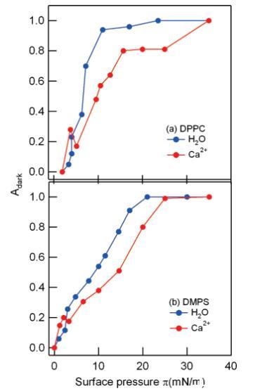 圖4:。在凈水(藍(lán)色)和1 M CaCl2溶液(紅色)上,DPPC(a)和DMPS(b)單分子膜的熒光圖像中暗有序LC域的部分面積Adark隨表面壓力的變化。注意周圍標(biāo)記的局部最大值~在存在Ca2+離子的情況下,兩種脂質(zhì)均為3 mN/m。
