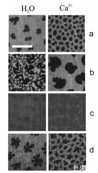 圖3:水上DPPC(a、b、c)和DMPS(d)單層的熒光圖像(左圖)和1 M CaCl2溶液(右圖),π)4 mN/M(a)、π)6.5 mN/M(b)、π)35 mN/M(c)和π)2 mN/M(d)。單分子膜用5 mol%羅丹明PE標(biāo)記:亮區(qū)對(duì)應(yīng)于LE相,暗區(qū)為LC結(jié)構(gòu)域。比例尺代表15μm。所有圖像的對(duì)比度都相同。