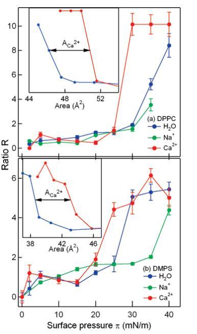 圖6:。作為DPPC(a)和DMPS(b)單分子膜表面壓力的函數(shù),CH3和CH2對(duì)稱拉伸振子強(qiáng)度的比值R:純水(藍(lán)色)、1 M NaCl溶液(綠色)和1 M CaCl2溶液(紅色)。由于單分子膜的崩塌,在π)40 mN/m時(shí),無法測定Na+-DPPC的比值R。由于壓縮單層膜的νsCH2振幅的不確定性,在較高壓力下,誤差條較大。插圖顯示了作為每種脂質(zhì)面積函數(shù)顯示的比率R。請(qǐng)注意~4?2/脂質(zhì)置換(解釋為Ca2+足跡),與圖2中的等溫線一致。
