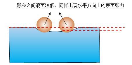 這時(shí),讓兩個(gè)親水的物體緩慢靠近,當(dāng)一個(gè)處于另外一個(gè)的毛細(xì)作用力范圍時(shí),由于毛細(xì)作用的相互耦合作用,兩個(gè)球形顆粒之間的液面會(huì)比兩側(cè)要高,這就打破了原來每個(gè)球形顆粒所受液體表面張力的對稱性,使表面張力的合力不再是垂直向下。出現(xiàn)了水平方向的分力,表現(xiàn)為相互吸引,如圖3。