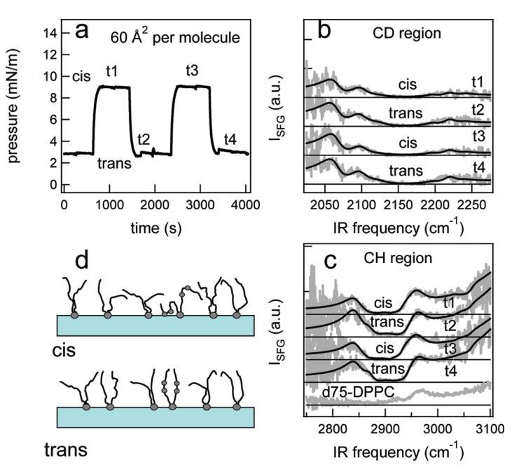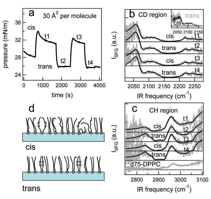 圖6:結(jié)果:DT Azo-5P/d75 DPPC的1:5混合物在脂質(zhì)/水界面上的面積為60?2/分子。(a)表面壓力與時(shí)間的關(guān)系。370和450 nm光照射~100秒分別產(chǎn)生cis(高壓)和trans(低壓)狀態(tài)。壓力的微小劇烈波動(dòng)是由于樣品高度的變化,以校正水的蒸發(fā)。(b)相應(yīng)的VSFG光譜(灰色)以及CD區(qū)域的擬合。為了清晰起見(jiàn),對(duì)光譜進(jìn)行了偏移。(c)VSFG光譜(灰色)與fits一起引導(dǎo)眼睛進(jìn)入CH區(qū)域。底部曲線顯示了P下純d75 DPPC的光譜~40 mN/m.(d)脂尾方向示意圖。光開(kāi)關(guān)脂質(zhì)的偶氮苯部分用灰色圓圈表示。