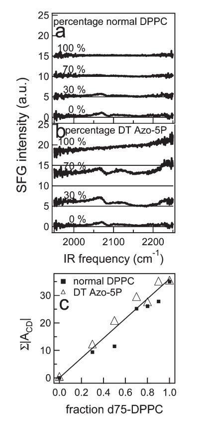 圖9:。(a)正常DPPC和d75 DPPC不同混合物的CD區(qū)VSFG光譜。圖中給出了混合物中正常DPPC的百分比。為清晰起見(jiàn),光譜偏移,細(xì)線表示零。(b)與a部分類(lèi)似,但適用于DT Azo-5P與d75 DPPC的混合物。(c)通過(guò)擬合VSFG光譜獲得的CD振動(dòng)振幅之和,如文中所述,作為含正常DPPC或DT Azo-5P的二元混合物中分?jǐn)?shù)d75 DPPC的函數(shù)。在本實(shí)驗(yàn)中,為了獲得混合物的高質(zhì)量數(shù)據(jù),紅外注量很高,導(dǎo)致通過(guò)VSFG光譜中相對(duì)較高的CH2和CD2振幅觀察到的脂質(zhì)尾部出現(xiàn)小的無(wú)序。