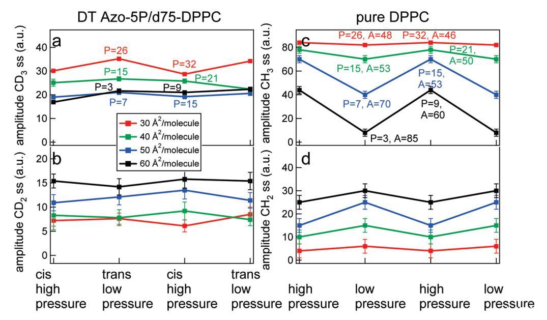 圖8:。d75 DPPC與DT Azo-5P比例為5:1的實(shí)驗(yàn)中d75 DPPC的擬合結(jié)果(左)和純正常DPPC的擬合結(jié)果(右)。(a)CD3對(duì)稱(chēng)拉伸振動(dòng)模式的振幅隨不同密度光開(kāi)關(guān)脂質(zhì)狀態(tài)的變化;(b)CD2對(duì)稱(chēng)拉伸振動(dòng)模式的振幅隨不同密度光開(kāi)關(guān)脂質(zhì)狀態(tài)的變化;右圖顯示了純DPPC在可比壓力下與左圖相似的結(jié)果,其中(c)為CH3對(duì)稱(chēng)拉伸振動(dòng)模式的振幅,(d)為CH2對(duì)稱(chēng)拉伸模式的振幅。共振的寬度和頻率在擬合中是固定的。