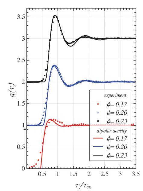 圖6顯示了實(shí)驗(yàn)g(r)與具有全偶極密度相互作用的BD模擬的比較,等式(4)。這里,為了方便起見,通過平均幾何距離rm來縮放距離r。對于實(shí)驗(yàn)g(r),我們從最匹配BD g(r)峰值位置的90%置信區(qū)間中選擇rm值??偟膩碚f,我們觀察到實(shí)驗(yàn)和模擬之間的顯著一致性。模擬結(jié)果高估了第一個(gè)最小深度,低估了第一個(gè)峰值寬度。這兩種差異可能歸因于多分散性效應(yīng),在我們的BD模擬中沒有考慮到。
