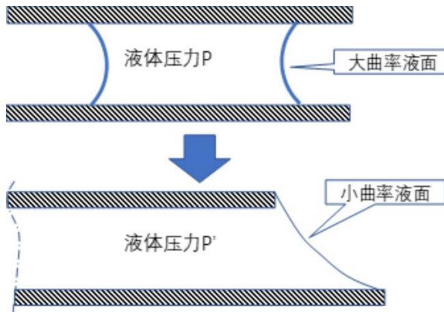 但是當(dāng)我們向著玻璃縫隙滴幾滴水,哪怕只是很少的幾滴,它們之間就不再牢固了,隨著水的不斷滴入,最后就不可避免地分開(kāi)了。這是因?yàn)榈稳胨粩噙M(jìn)入縫隙,最后就會(huì)破壞掉前面所述的曲率很大的液面,導(dǎo)致液體壓力與外界氣壓的差迅速降低,于是它們就無(wú)法繼續(xù)沾在一起了。這個(gè)過(guò)程可以圖示如下: