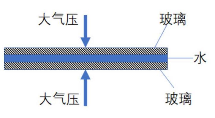 流行科普上講,由于玻璃之間充滿了水,它們之間沒(méi)有空氣,因而靠大氣壓就可以把它們緊密地?cái)D壓在一起。如下圖所示: