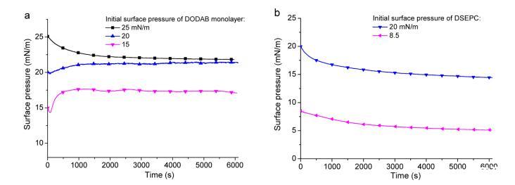 圖4.GO在不同表面壓力下對(a)DODAB和(b)DSEPC單層的吸附研究(表面壓力與經(jīng)過時(shí)間的關(guān)系)。首先將單層壓縮至純水亞相上的一定表面壓力,然后小心地將600μL 1 mg/mL GO分散液緩慢注入單層下方的水亞相。