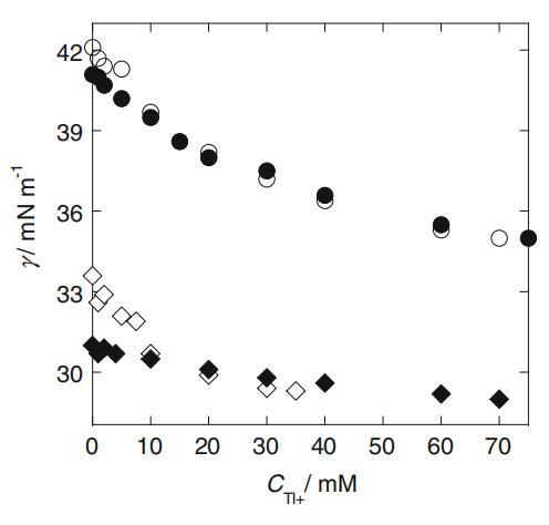 圖6不同pH值下取決于Tl+摩爾濃度的界面張力(γ)曲線圖:pH=8.0時(shí),SLAS的白圈3.0mm和黑圈4.0mm,pH=5.5時(shí),SLAS的白圈2.5mm和黑圈3.5mm