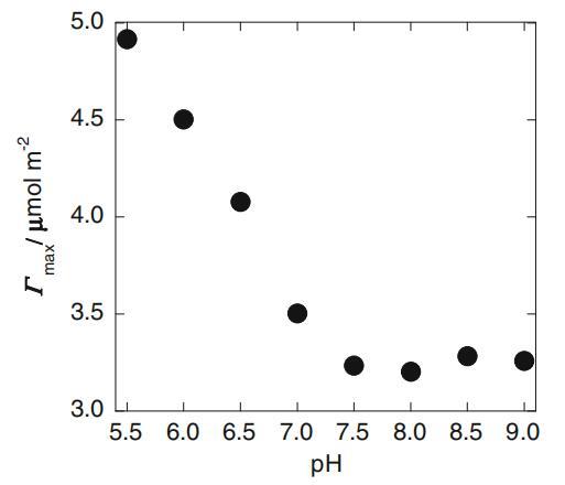 其中CS、R和T分別為表面活性劑總濃度、氣體常數(shù)和溫度。由于所有樣品溶液都含有過量的鈉鹽作為緩沖液并保持在恒定pH值,因此i值(濃度隨表面活性劑濃度變化的離子種類數(shù))取為1。圖5中繪制了最大值與pH值的關(guān)系圖。最大值在小于7.3的pH值下顯著增加,與cmc/C20比值的值相同。這些結(jié)果肯定表明,當(dāng)pH值降至7.3以下時(shí),在溶液表面用H+替換SLAS的Na+,也就是說,在pH值>7.3時(shí),NDO癸?;“彼彡庪x子的反陽離子(LAS?)是空氣-水界面處的所有Na+。因此,估計(jì)了H+LAS的pKa值?另一方面,在含水體中,我們根據(jù)不同SLAS濃度下的pH值,確定了含水體相中HLAS的pKa值為3.3,該pH值在氮?dú)夤呐莸娜セ鸺兯小km然我們還無法確定組裝的HLA的確切pKa值,因?yàn)樯形传@得HLA的最大值,但毫無疑問,其值大于含水體相中HLA單體的值3.3。一些文獻(xiàn)也報(bào)道了自組裝過程中pKa值的增加[12,13]。