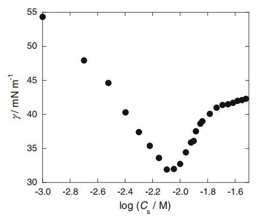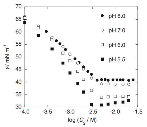 在圖1中,僅含SLAS且不含任何緩沖液的水溶液的界面張力(γ)與總SLAS摩爾濃度(CS)的對數(shù)作圖。如圖所示,盡管SLAS仔細(xì)重結(jié)晶,但γ值出現(xiàn)了異常的最小值。然后,樣品溶液的pH值在浸漬底部約為5.5,并隨CS增加至約8。由于此浸漬應(yīng)是由取決于SLAS濃度的pH變化引起的,因此所有實(shí)驗(yàn)均在磷酸鹽和硼酸鹽緩沖液控制的恒定pH下進(jìn)行。則圖1中觀察到的下降在每個(gè)值的受控pH下完全消失(見圖2)。cmc后,pH 5.5下的γ值略有增加,因?yàn)闃悠啡芤旱膒H因其緩沖容量的限制而緩慢增加。在1.0mM(膠束前濃度)和25mM(膠團(tuán)后濃度)的恒定CS下,γ值相對于pH值繪制在圖3中,其中還繪制了十二烷基硫酸鈉(SDS)的結(jié)果作為對比示例。與SDS相比,非常有趣的是,當(dāng)pH值低于約7時(shí),SLAS的γ值顯著降低。接下來,圖4中繪制了cmc和C20(其γ值比純水的γ值降低20 mN/m時(shí)的表面活性劑濃度)與pH的關(guān)系圖。這兩個(gè)值在較低pH值區(qū)域也降低,盡管SDS的pH值不隨pH值而變化(數(shù)據(jù)未顯示)。此外,如該圖中cmc/C20比率的曲線圖所示,這些比率在pH值小于7.3的區(qū)域內(nèi)增加。該比率的增加通常意味著親水性頭基的尺寸增加和/或表面活性劑的反離子與頭基的結(jié)合更緊密[11]。
